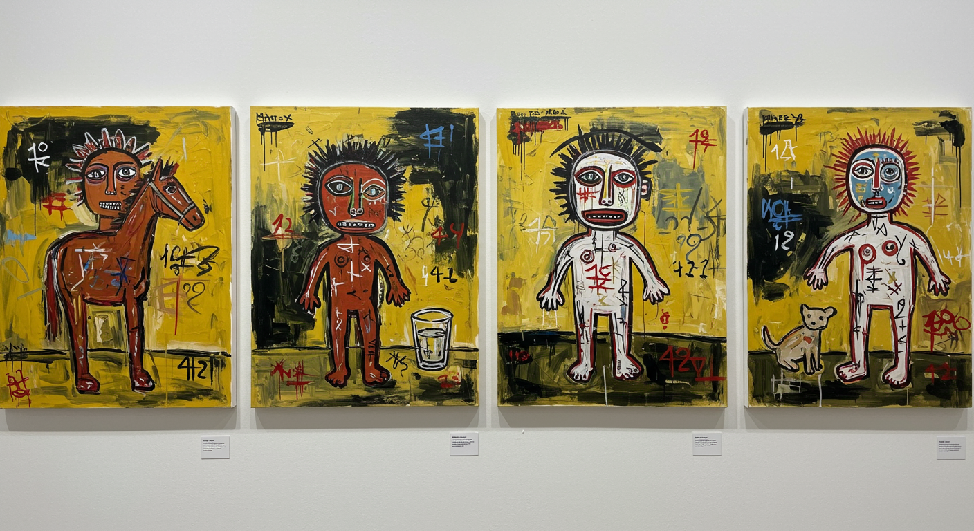 A grouping of black-and-white paintings and painted sculptures were part of a series of matadors and bulls that intrigued gallery guests, as well as wildly popular variations of a shadowy horse and rider like one holding a spear and shield against a bold yellow backdrop with the words “Don Quixote” written in dripping red paint.