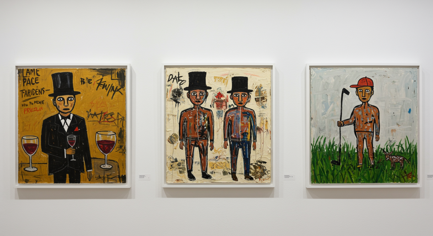 Buyers often hang such pieces near their wine collections, like the acrylic painting “Wine Auction” that portrays a “1st-time wine buyer” and a “smug wine buyer” amidst phrases written in oil stick like “wines of Utah” that are “aged in cardboard for days.”