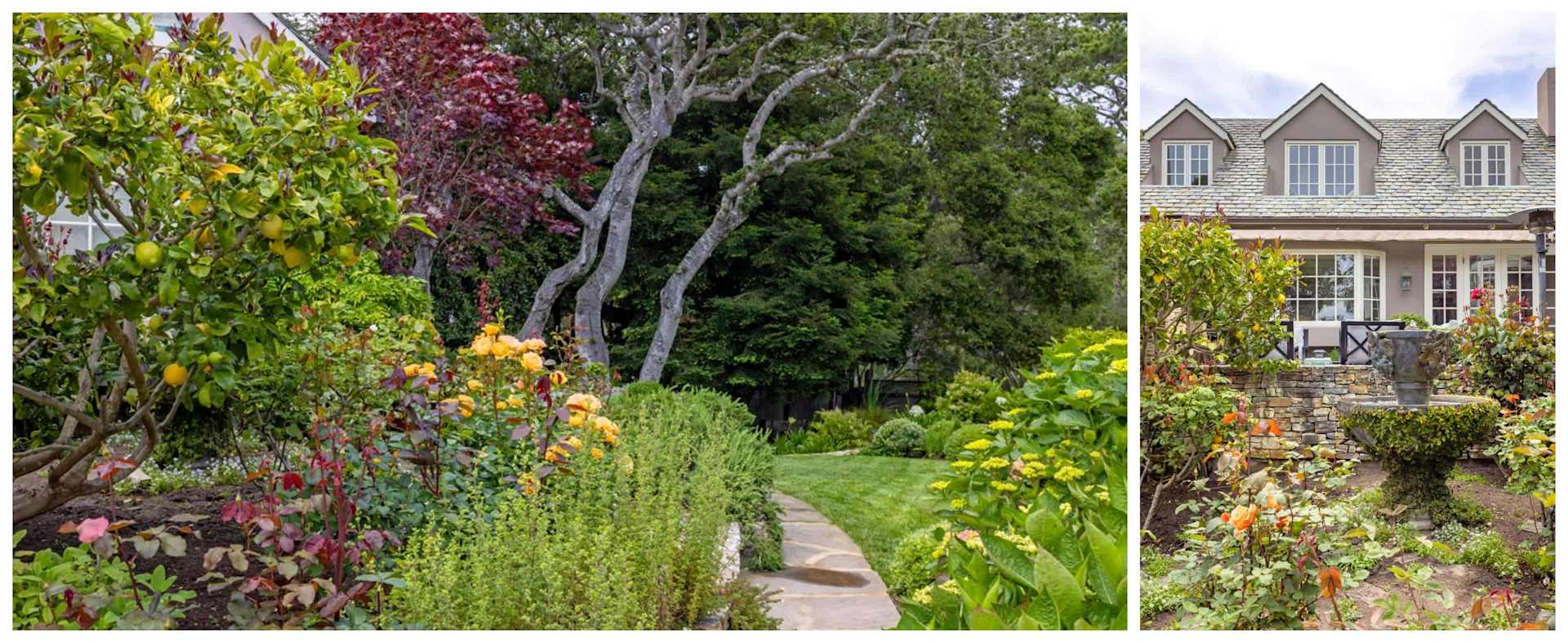According to the owner of this Pebble Beach property, the upper garden is made up of valerian, aquilegia, yellow California poppies, geranium Bill Wallis, yellow nasturtium, caryopteris, geranium maderense, ratibada, pelargonium sidoides, a tulip tree, tree ferns, cineraria, knautia and agapanthus blue and white. The lower garden, designed in honor of her husband, is made up of seeds of camomile, evening primrose, poppies, nasturtium, nigella, flax, monbrecia and shrubs of coffeeberry and ceanothus. The courtyard features lemon and lime trees, vines of passiflora membrancea and solandra, aka gold cup, hardy geraniums blue, Japanese anemones white, and oak leaf hydrangeas (photos above).