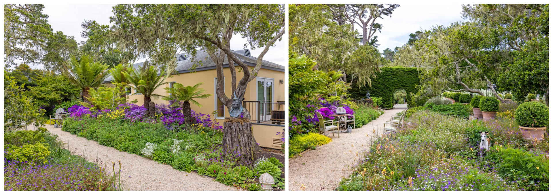 “Stepping out the front door of this Carmel home (photos above), one finds a marvelous stone pig which is nestled in some lomandra grass, some loropetalum, ferns, and then balls of boxwood, pittosporum tenuifolium and pittosporum crassifolium,” de Sibert says. “Camellias are from the Carmel-by-the-Sea Garden Club’s legendary Shirley Meneice, a renowned camellia expert, who recently passed away. There many oak leaf hydrangeas and white abutilon are mixed in, creating a green garden.”